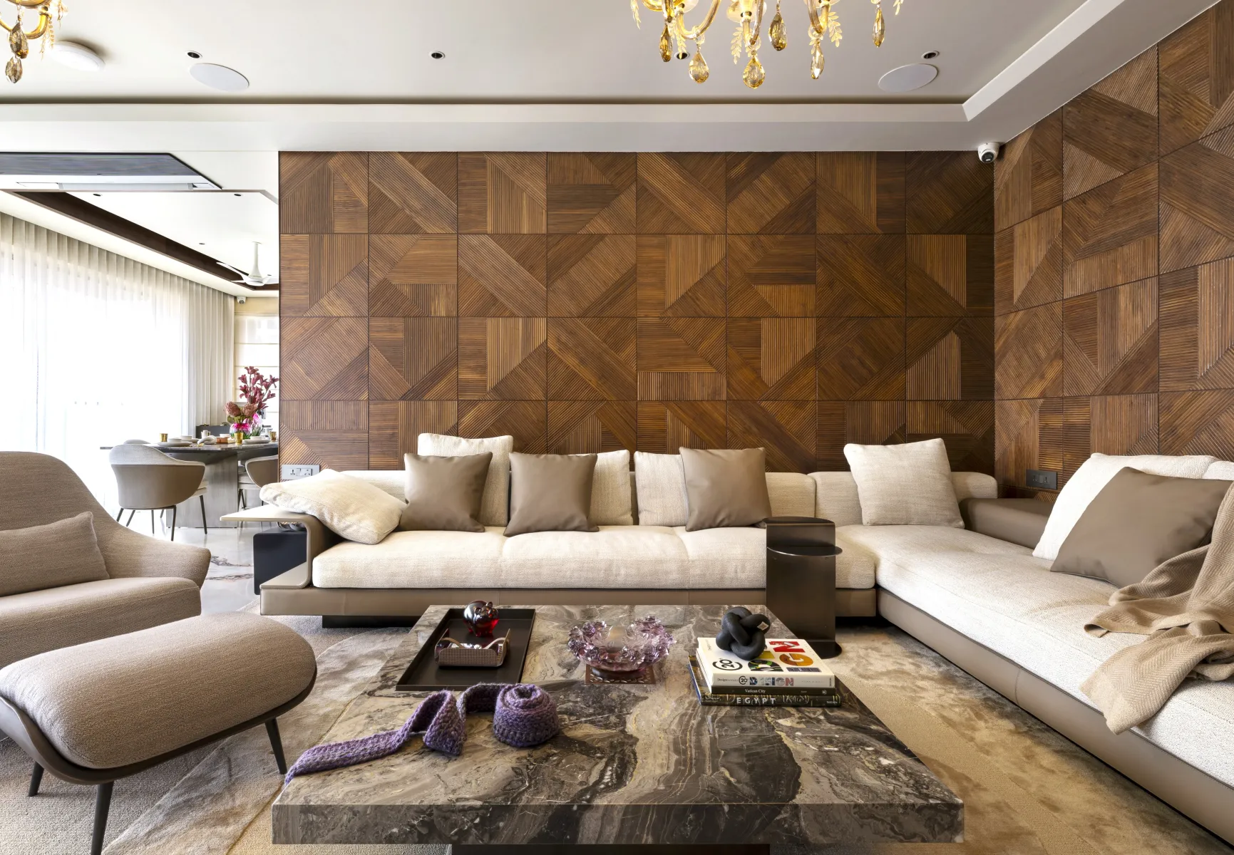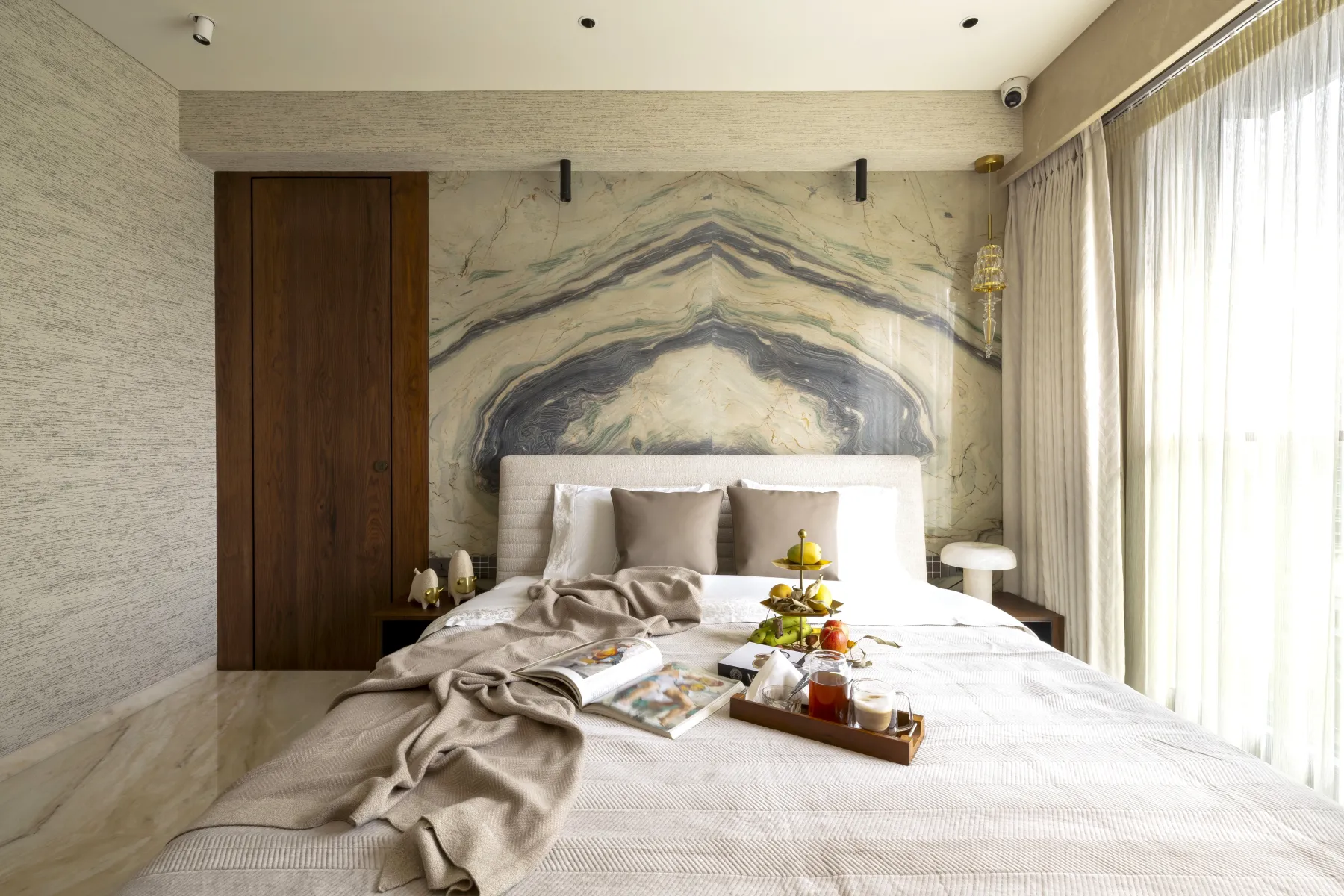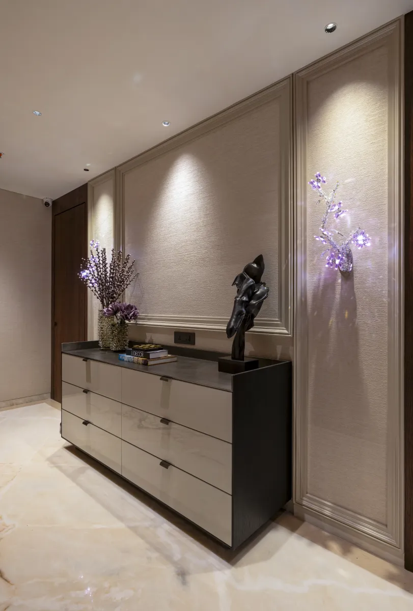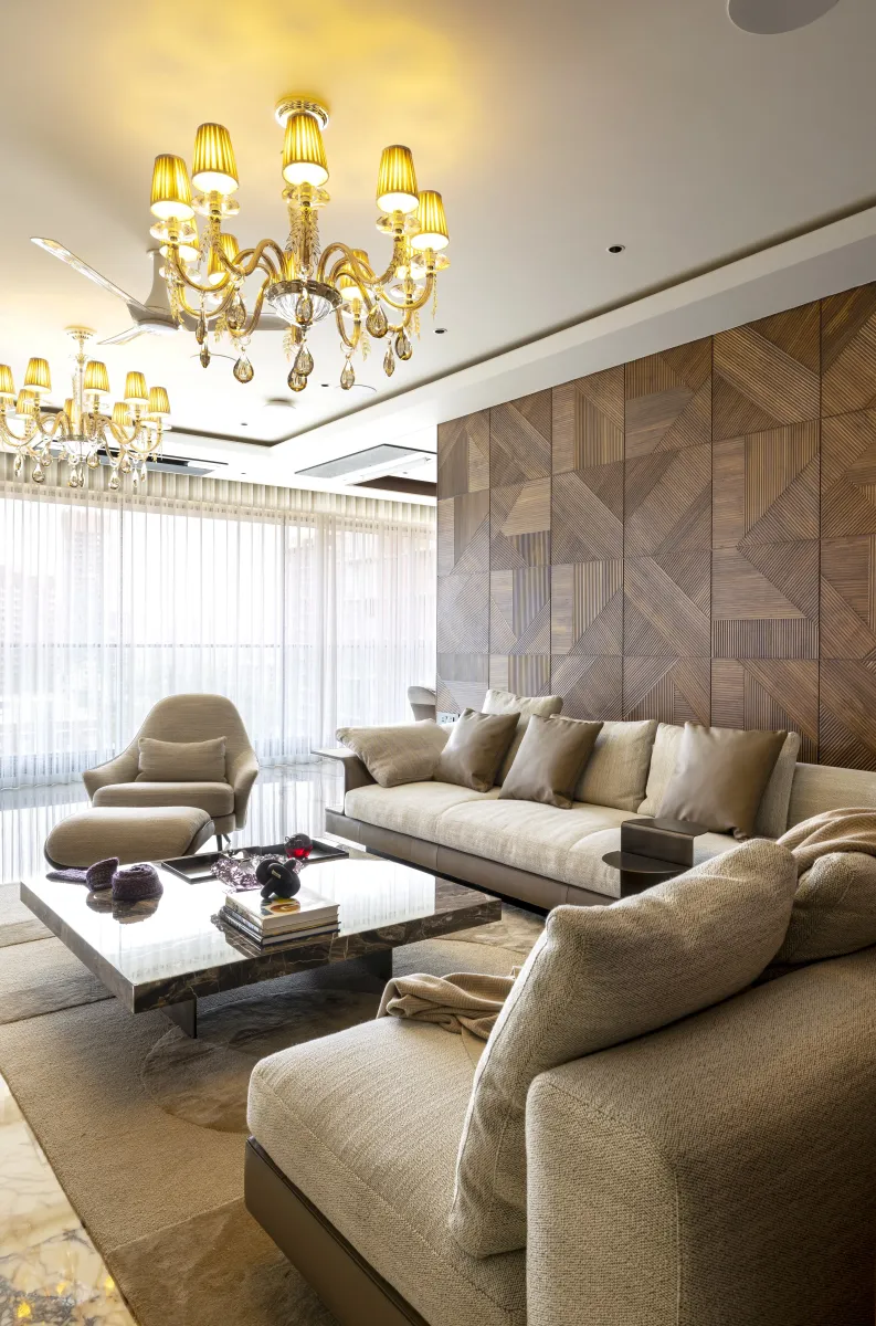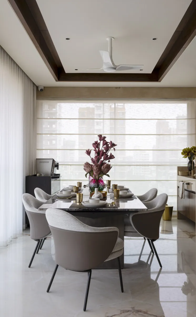 This dining area reflects a refined sense of modern luxury, designed with simplicity, warmth, and elegance. The centerpiece is a sleek marble-top dining table, complemented by six upholstered chairs in soft grey and taupe tones that balance comfort with contemporary form. The neutral color palette keeps the space sophisticated and airy, while subtle golden accents in the tableware and vases add a touch of opulence. The ceiling design features a clean, recessed profile with a wooden border and a modern white fan, enhancing the space with structure and detail. Floor-to-ceiling sheer curtains allow filtered daylight to flood the room, creating a bright, inviting atmosphere and highlighting the polished marble flooring.