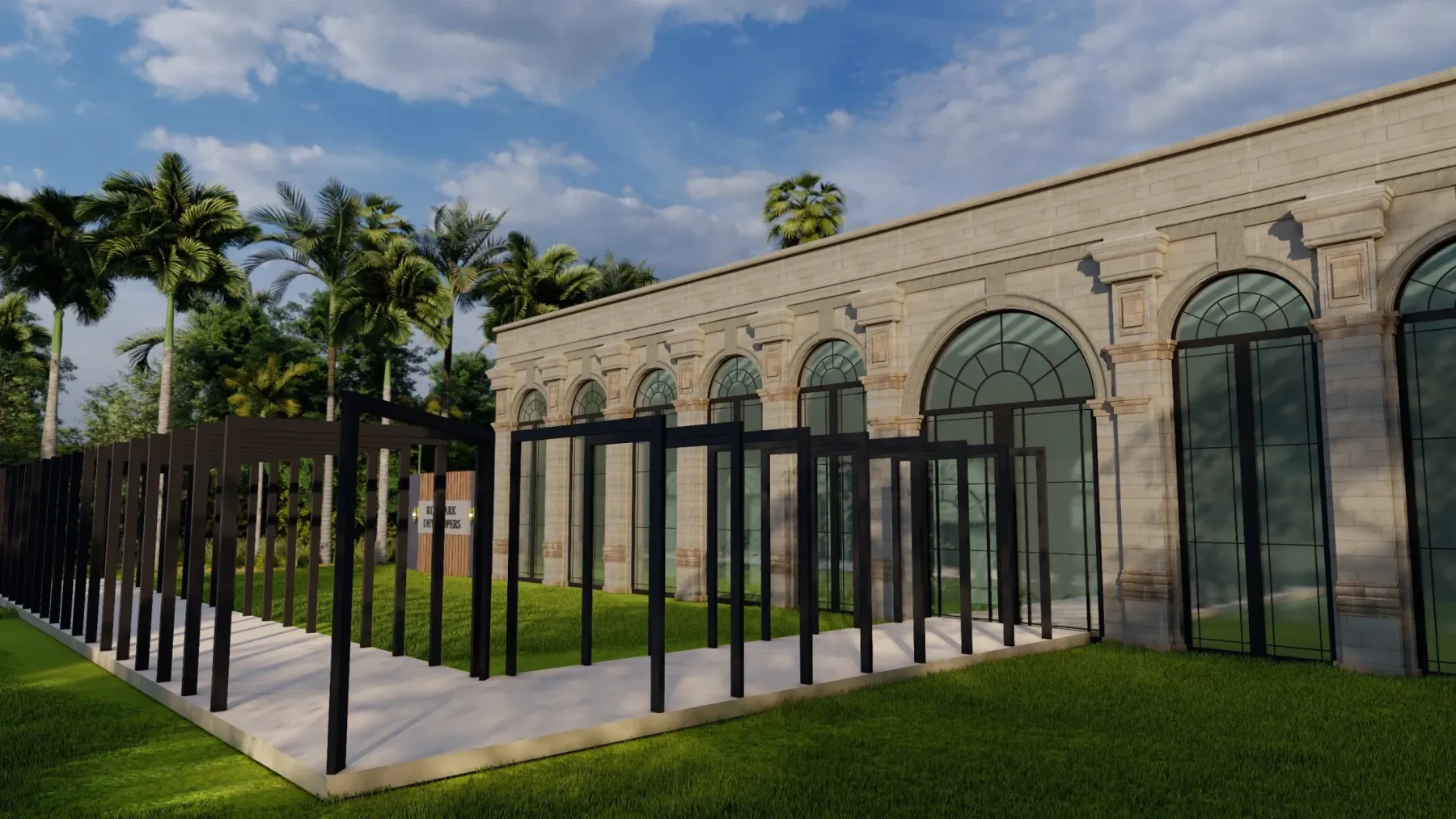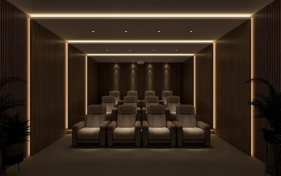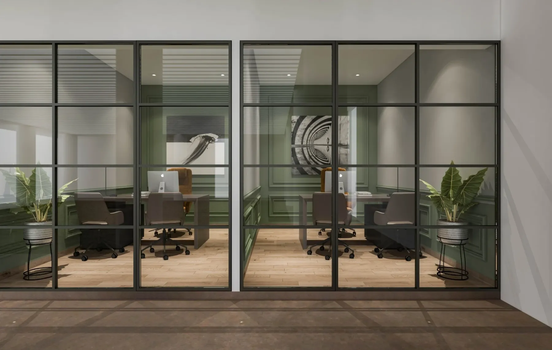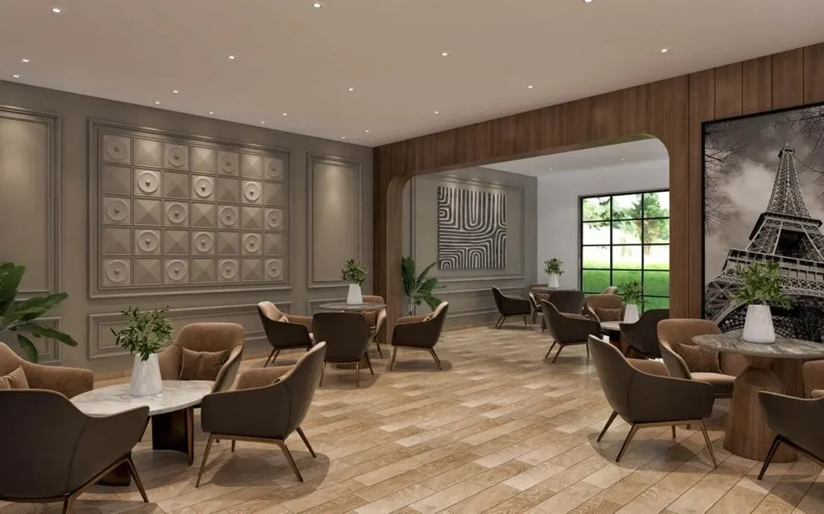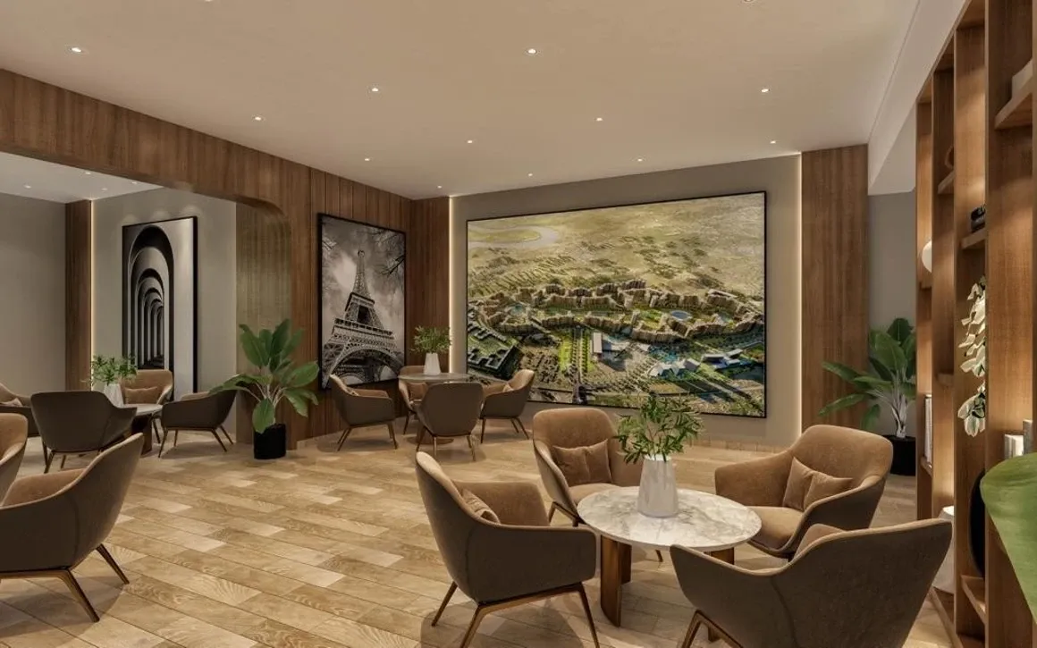 This office reception area exudes a modern and sophisticated ambiance, defined by its warm wood tones, clean lines, and sculptural elements. The standout feature is the angular, metallic gold reception desk that adds a bold statement against the vertical wooden slat backdrop Soft overhead lighting and elegant pendant lamps cast a welcoming glow, while indoor plants bring a refreshing natural touch. A large glass partition with wooden framing separates the lounge behind, filled with curated decor and contemporary art pieces, enhancing the space with character and creativity. The overall design creates a professional yet inviting atmospher.