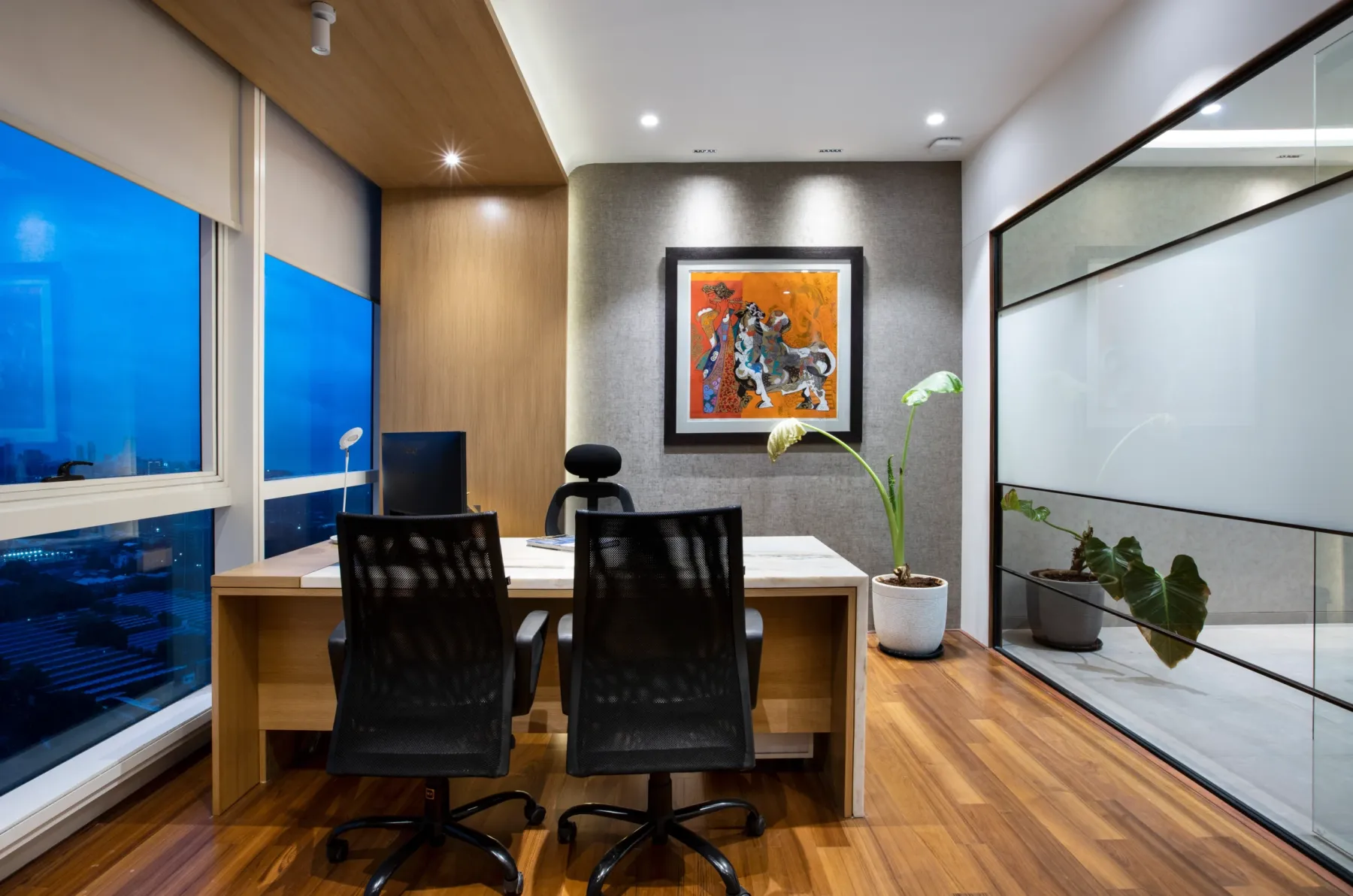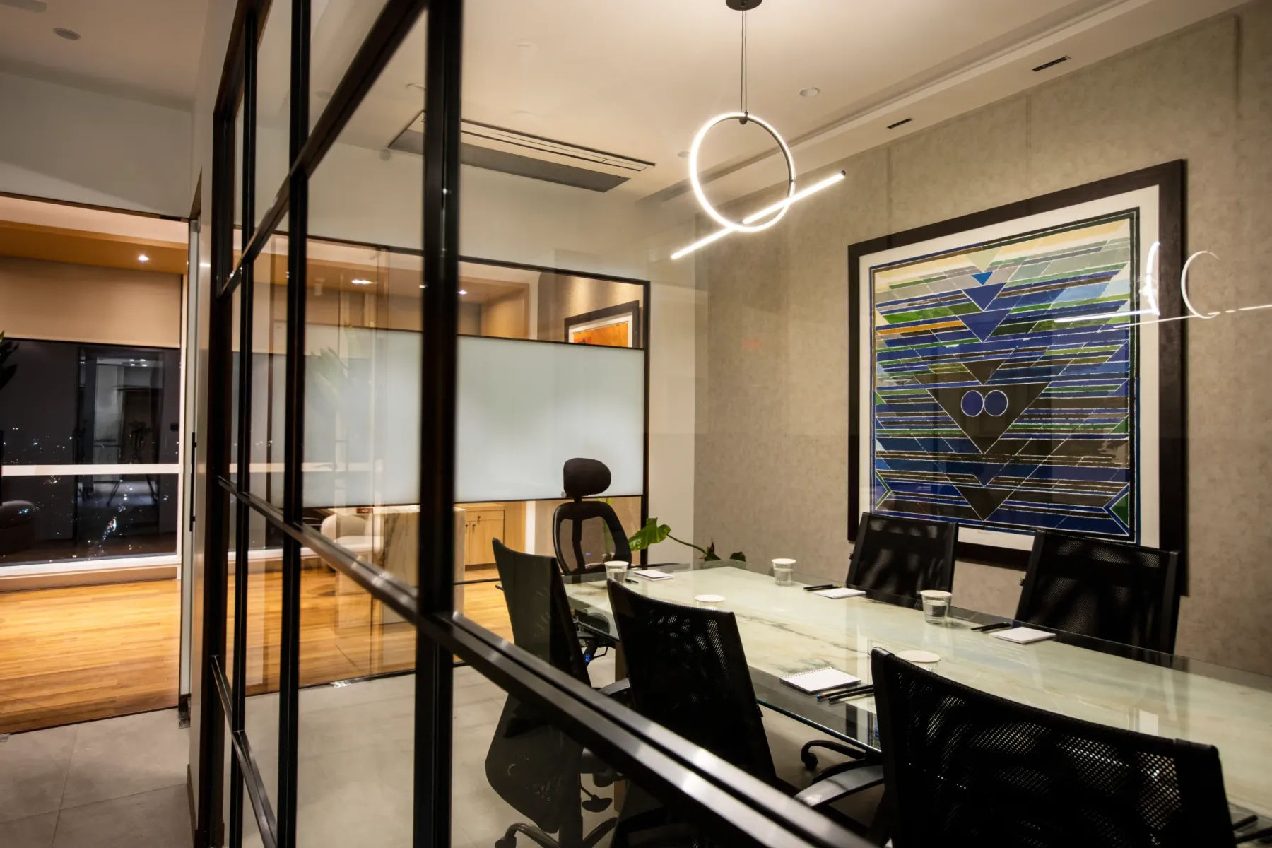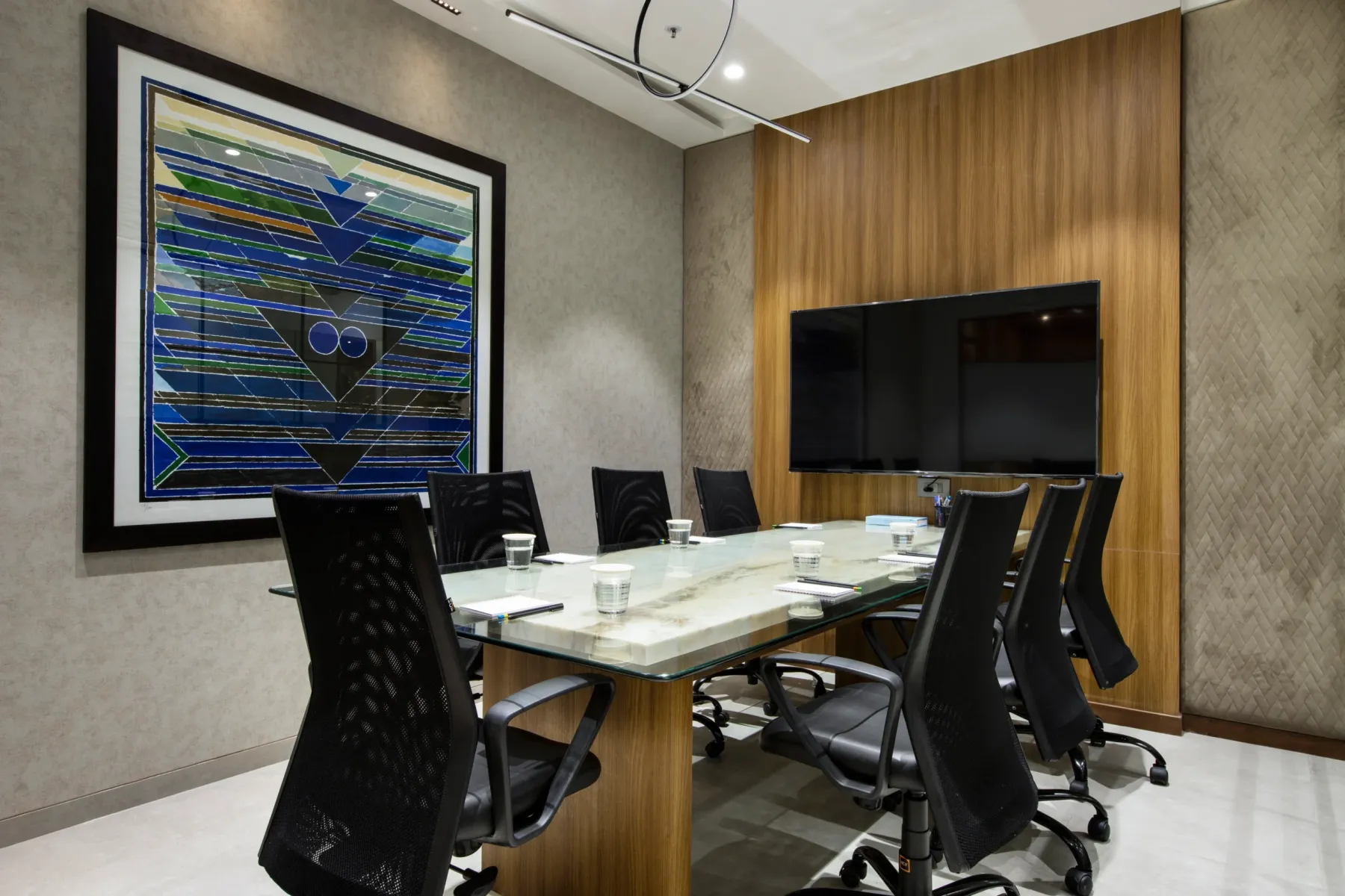 This modern conference room blends professionalism with cultural elegance. It features a sleek wooden table with stylish swivel chairs, a large wall-mounted screen, and warm wood paneling. Artistic wall frames and a touch of greenery add vibrancy, while recessed and pendant lighting create a focused yet welcoming ambiance—perfect for meetings and presentations.