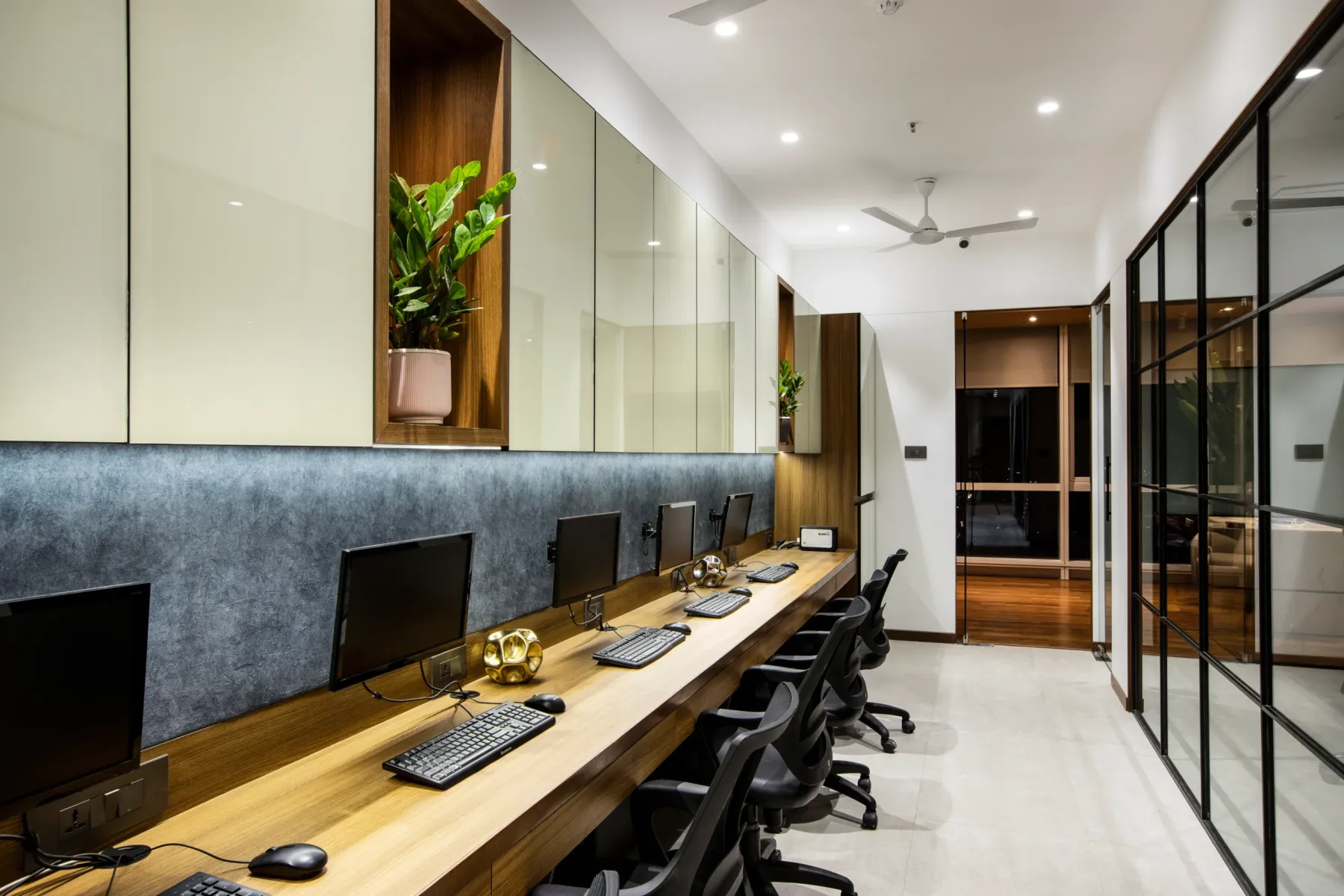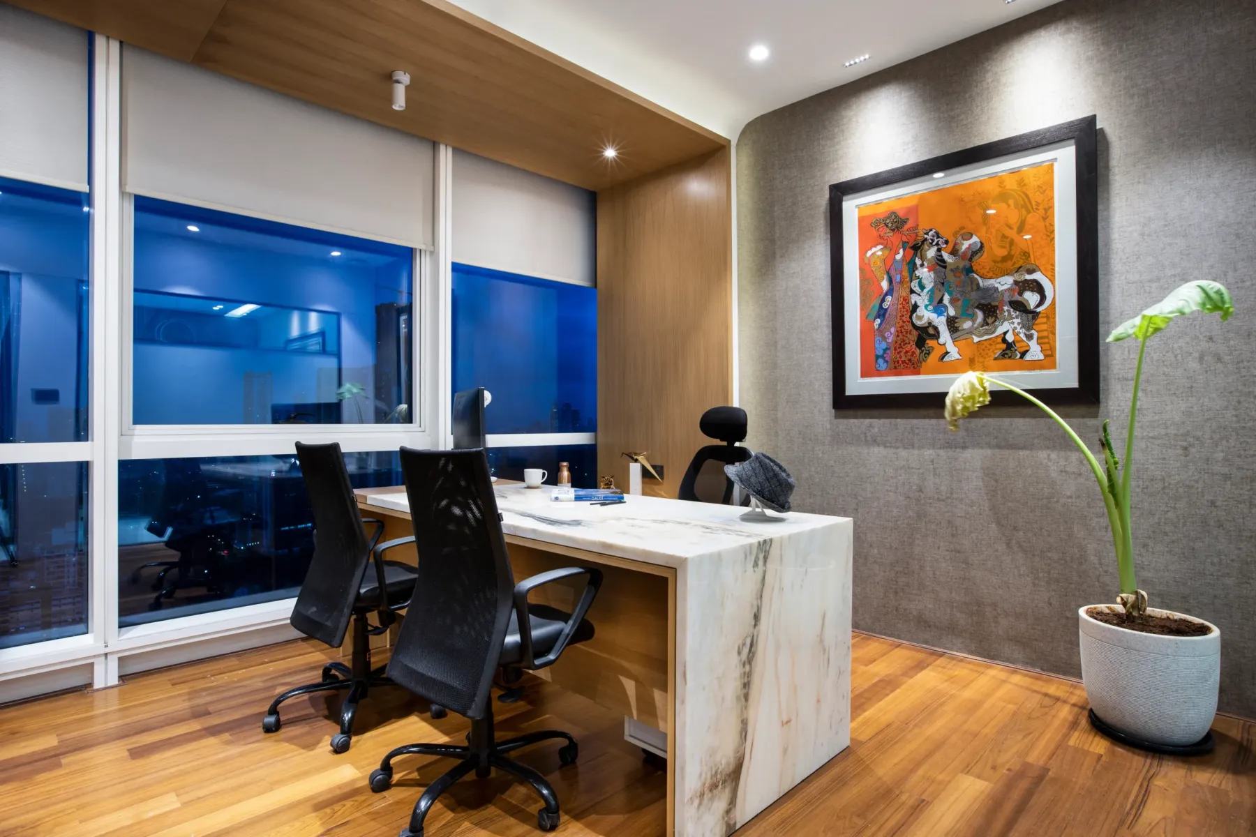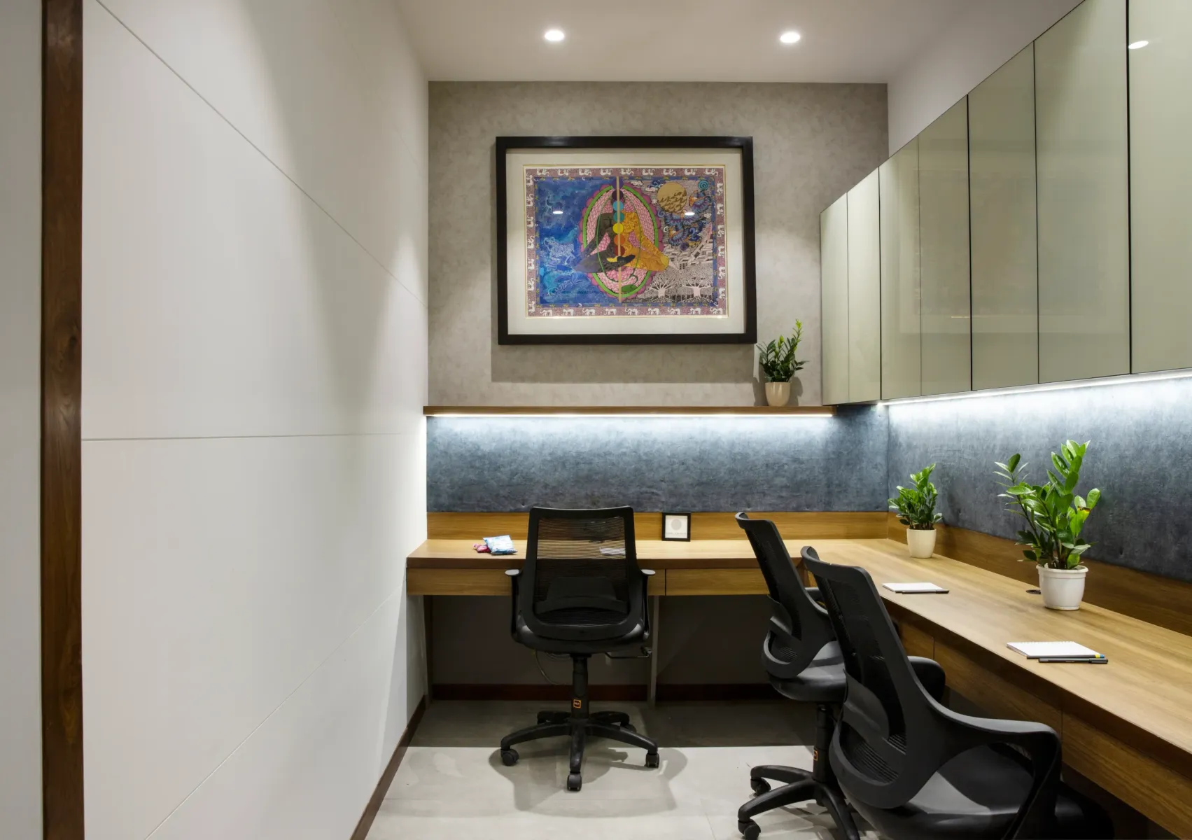 This modern conference room blends professionalism with cultural elegance. It features a sleek wooden table with stylish swivel chairs, a large wall-mounted screen, and warm wood paneling. Artistic wall frames and a touch of greenery add vibrancy, while recessed and pendant lighting create a focused yet welcoming ambiance—perfect for meetings and presentations.