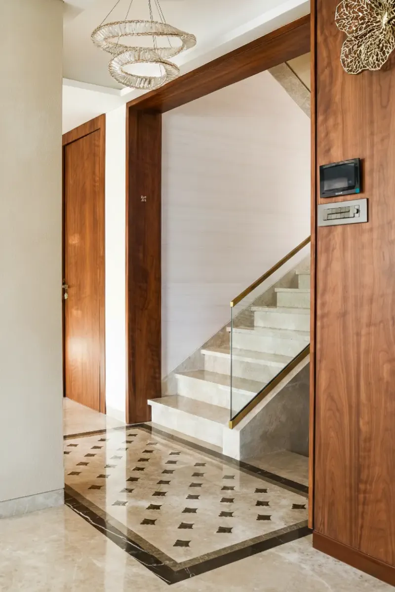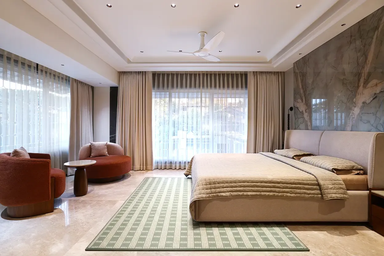 This living room is thoughtfully designed with a harmonious blend of elegance and comfort, anchored by a soft neutral color palette that exudes calm and sophistication. Plush beige sofas and upholstered seating create a warm, inviting setting, while the dark stone-finish wall panels add depth and a refined contrast. Large windows with sheer blinds allow natural light to flow in gently, enhancing the sense of openness and balance. Sculptural ceiling lights and minimal accent furniture introduce a contemporary touch, while layered textures in the rugs, cushions, and décor bring visual richness. Overall, the space reflects a modern luxury aesthetic that feels serene, timeless, and perfect for relaxed yet refined living.