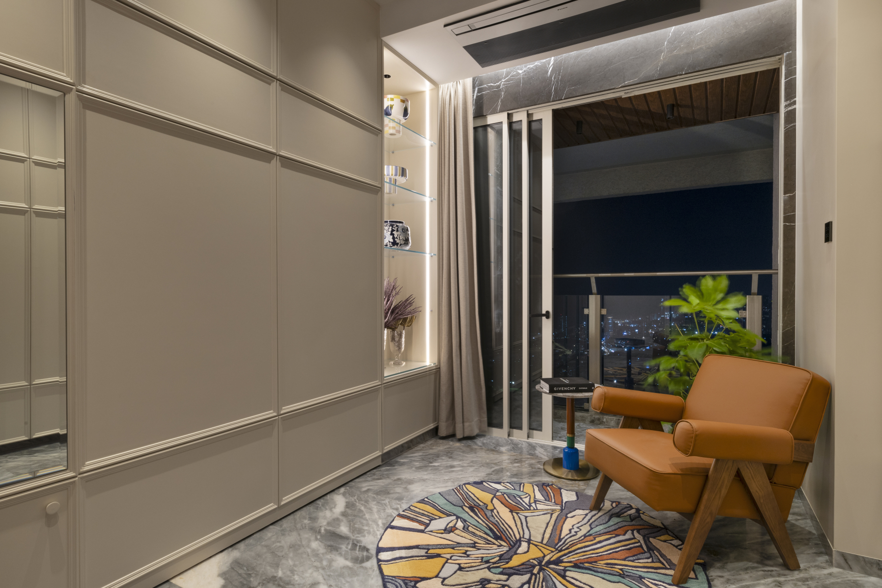 Perched above the city, this 69th-floor residence was shaped to let the skyline in. Whether from the bar, the bedroom, or the balcony, the home opens up to the energy of Mumbai yet remains your calm in the clouds.