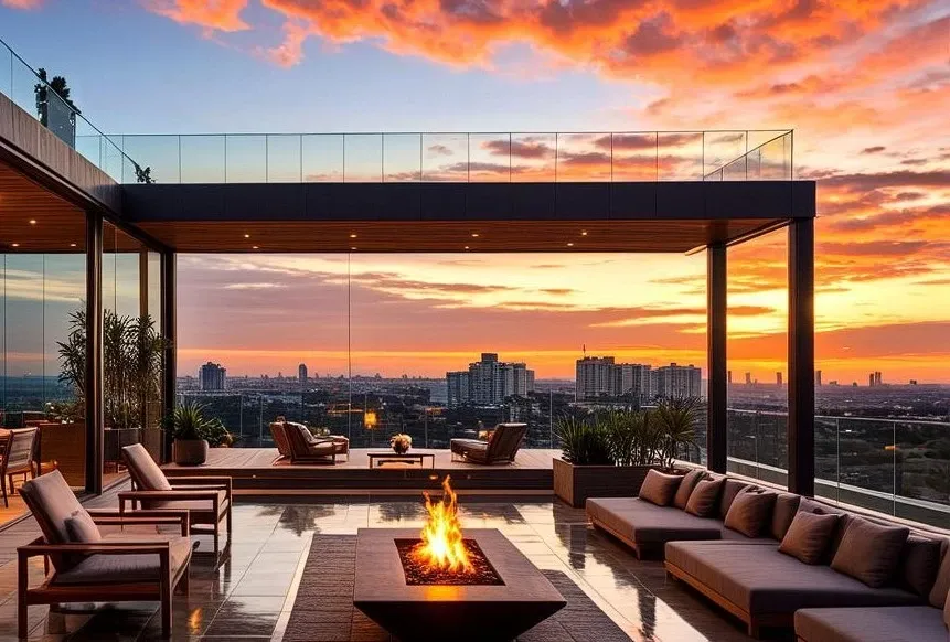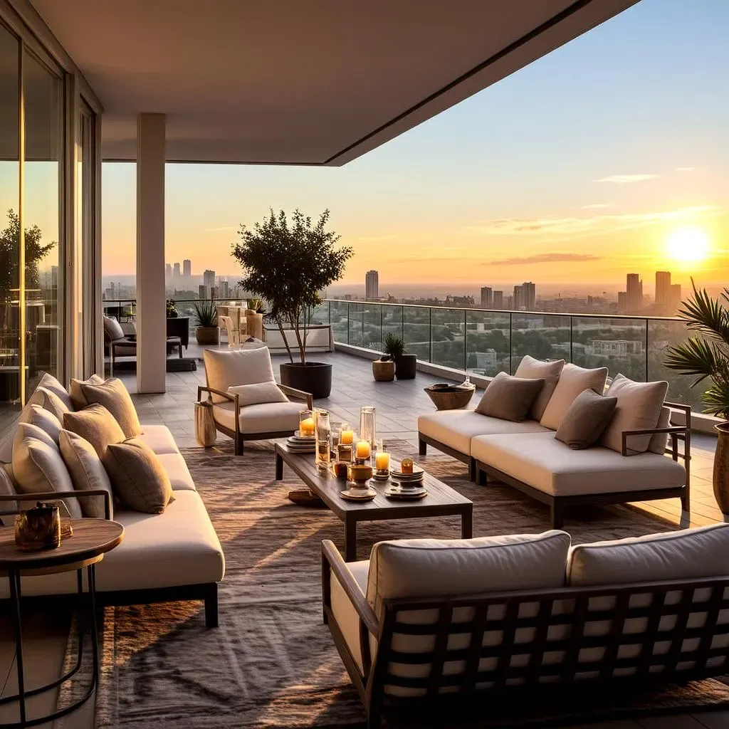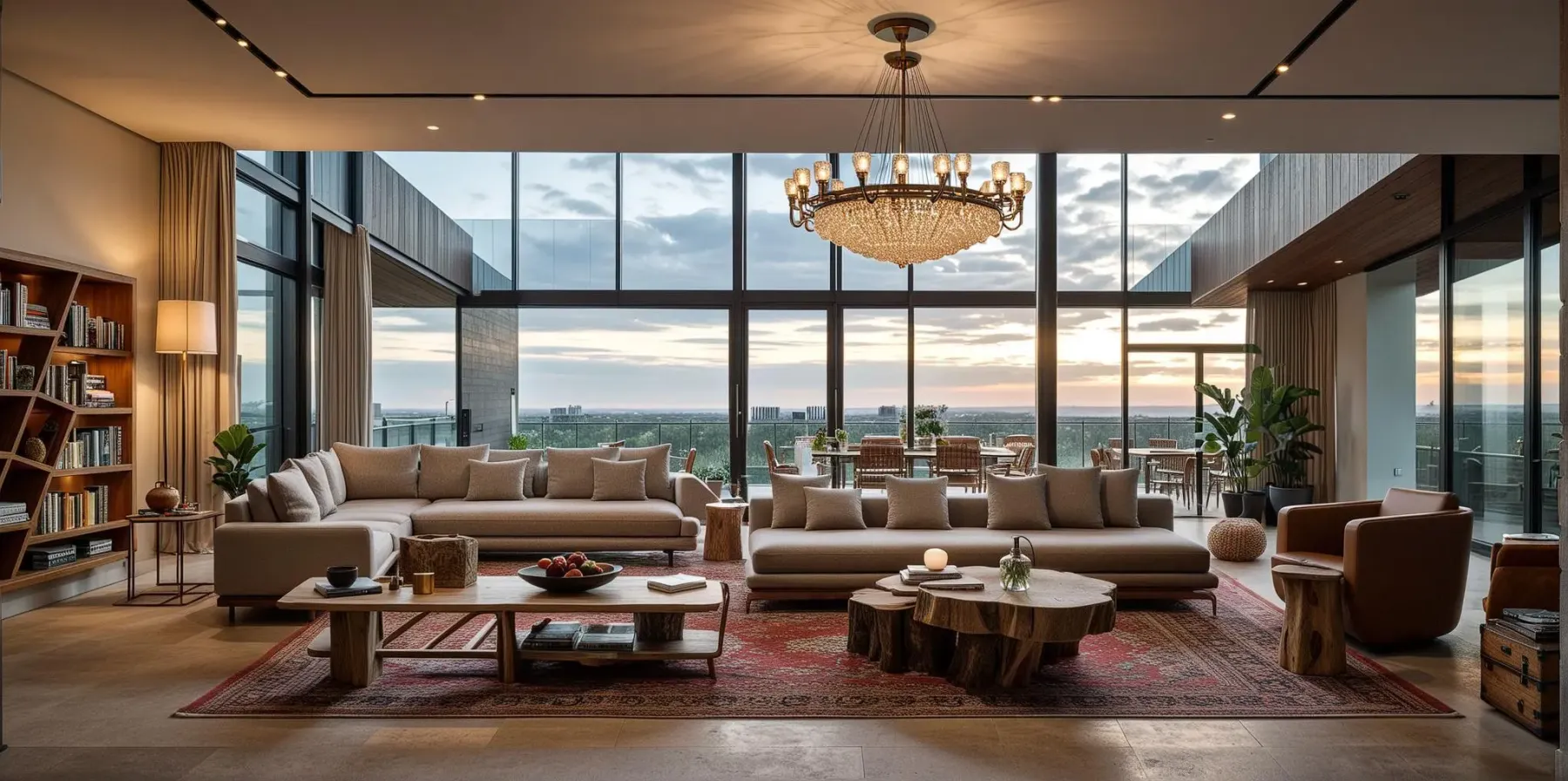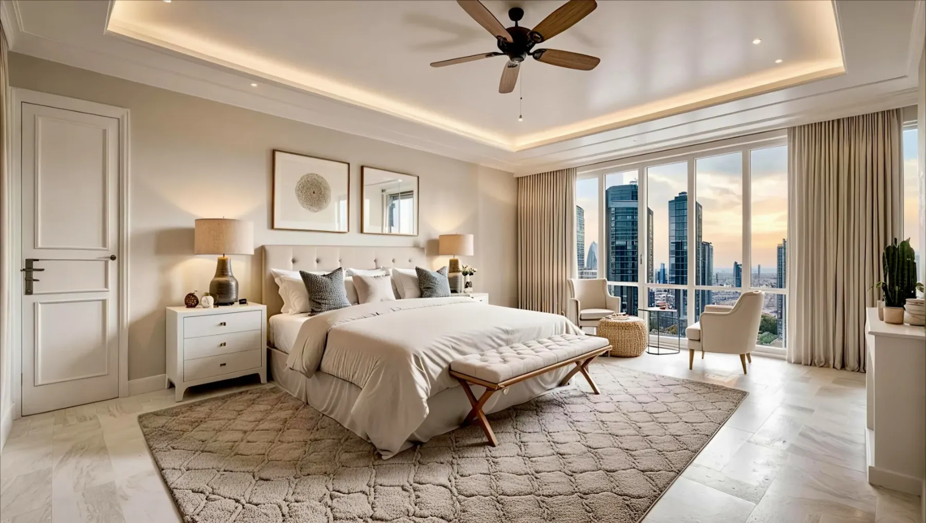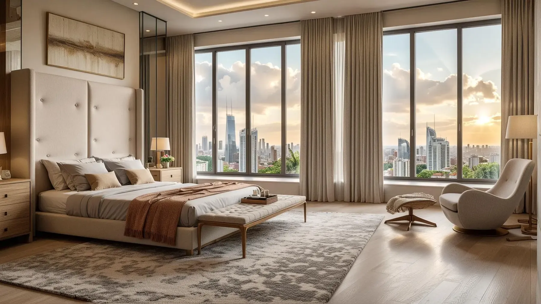 This bedroom showcases a luxurious and serene design with a modern, minimalist aesthetic. It features a tall, tufted headboard that adds elegance and height, complemented by neutral-toned bedding and warm accent pillows. Natural light floods the space through large floor-to-ceiling windows offering a stunning cityscape view, framed with full-length drapes. Soft wooden flooring and a textured area rug add warmth, while the cozy reading corner with a stylish lounge chair and floor lamp enhances comfort. The space is balanced with subtle decor, warm lighting, and a calm, earthy palette that creates a restful, upscale retreat.